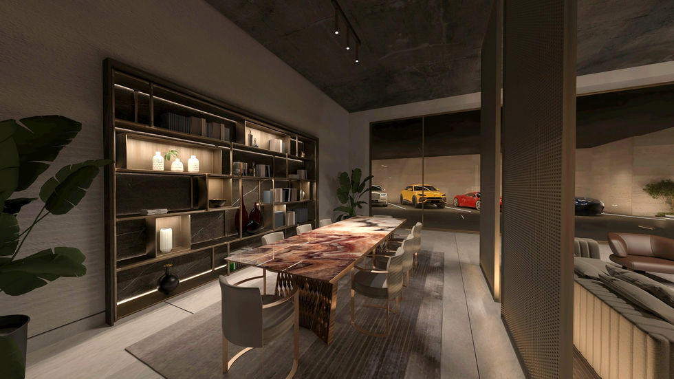 The smaller of the two halls has been transformed into a home theater, luxuriously furnished with Minotti sofas, Henge side tables, and sophisticated table lamps. The larger hall has been redesigned to serve as an entertainment space, complete with a seating area, dining section, bar and a gaming zone. Here, guests can indulge in games on the Vismara table, watch TV, or engage in a game of chess. Amidst these activities, the breathtaking view of the luxury cars and upscale furniture ensures a rich visual experience.